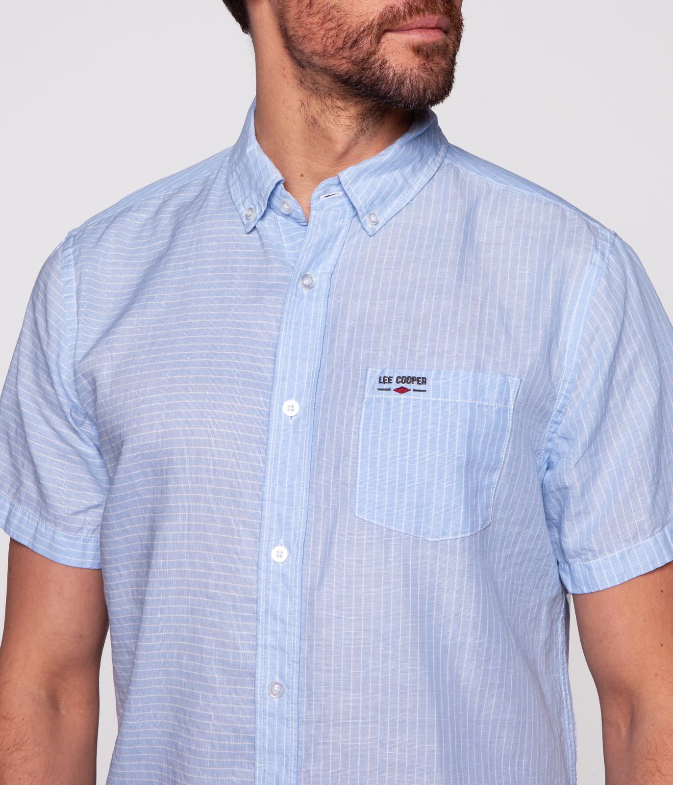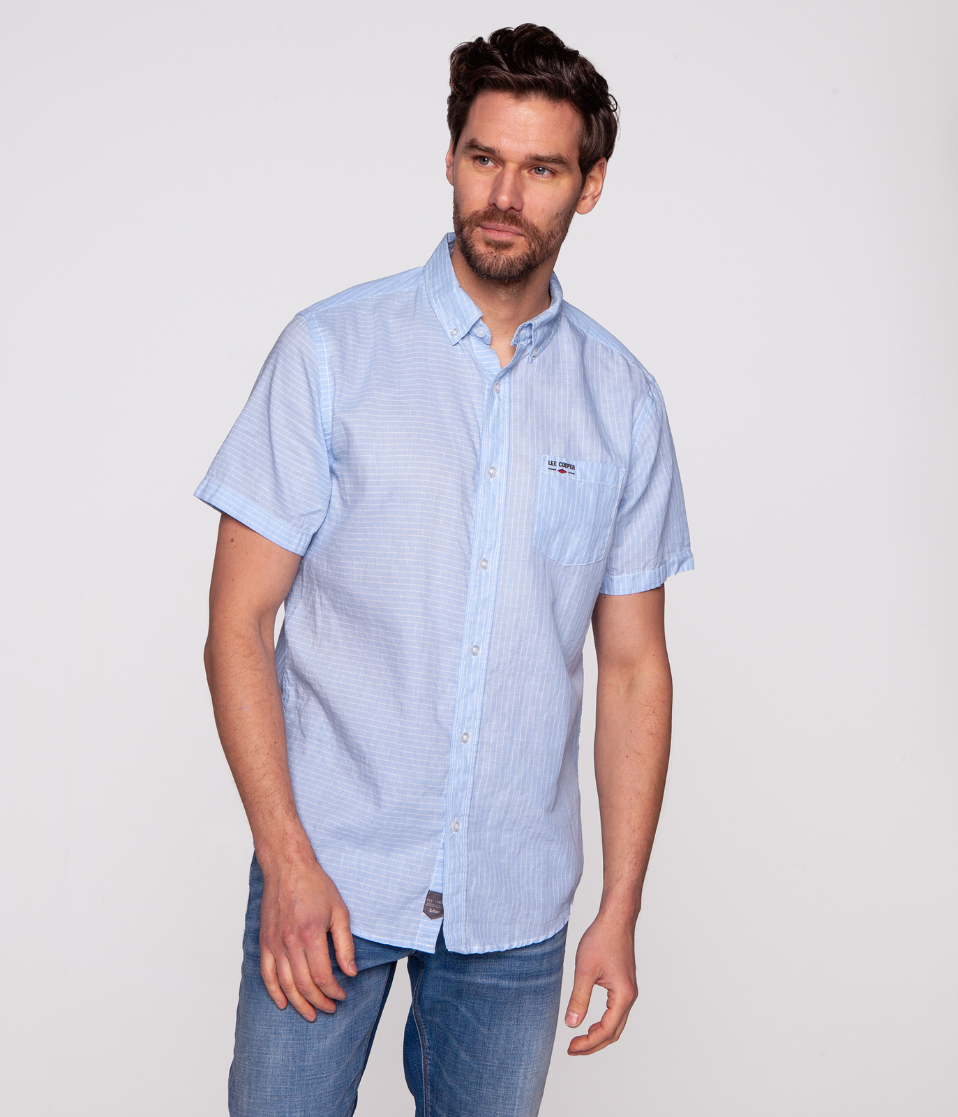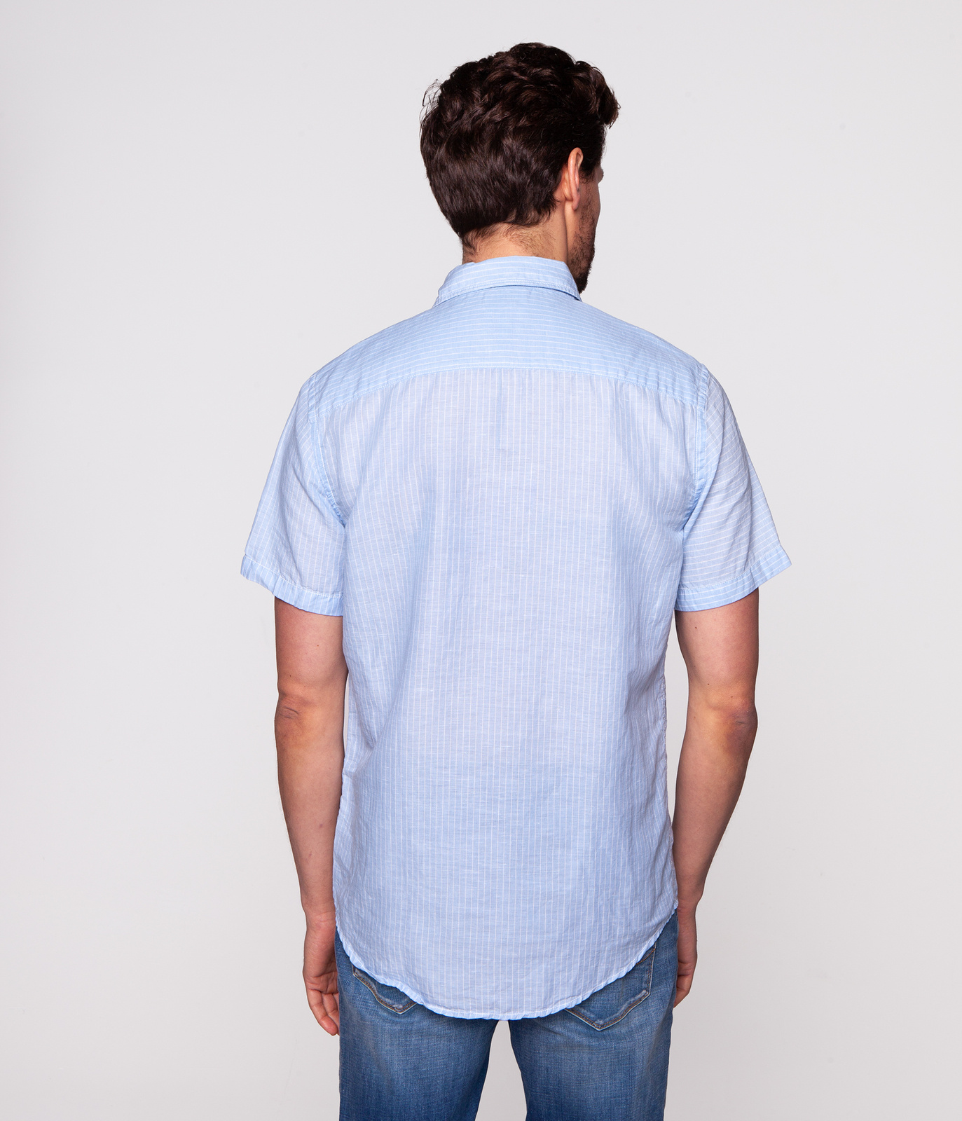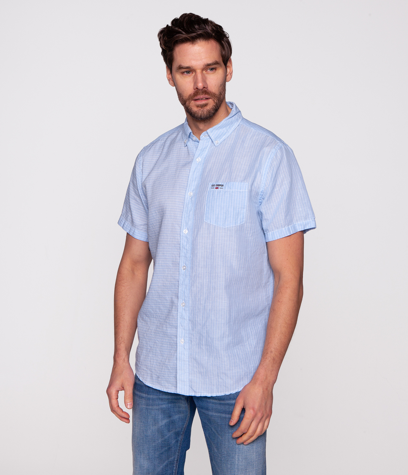 Koszula męska w drobne paski, krótki rękaw, regularny fason (REGULAR fit). Uszyta z bawełnianej tkaniny z dodatkiem lnu. Klasyczny kołnierzyk. Zapięcie na guziki.