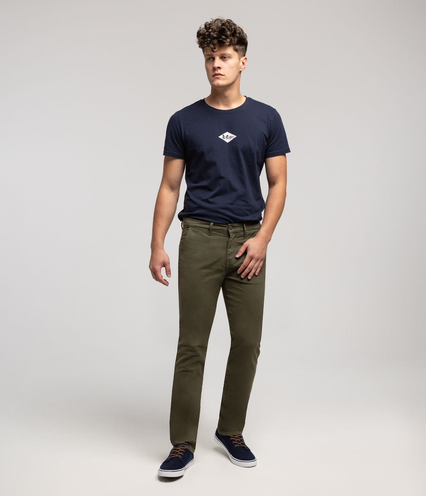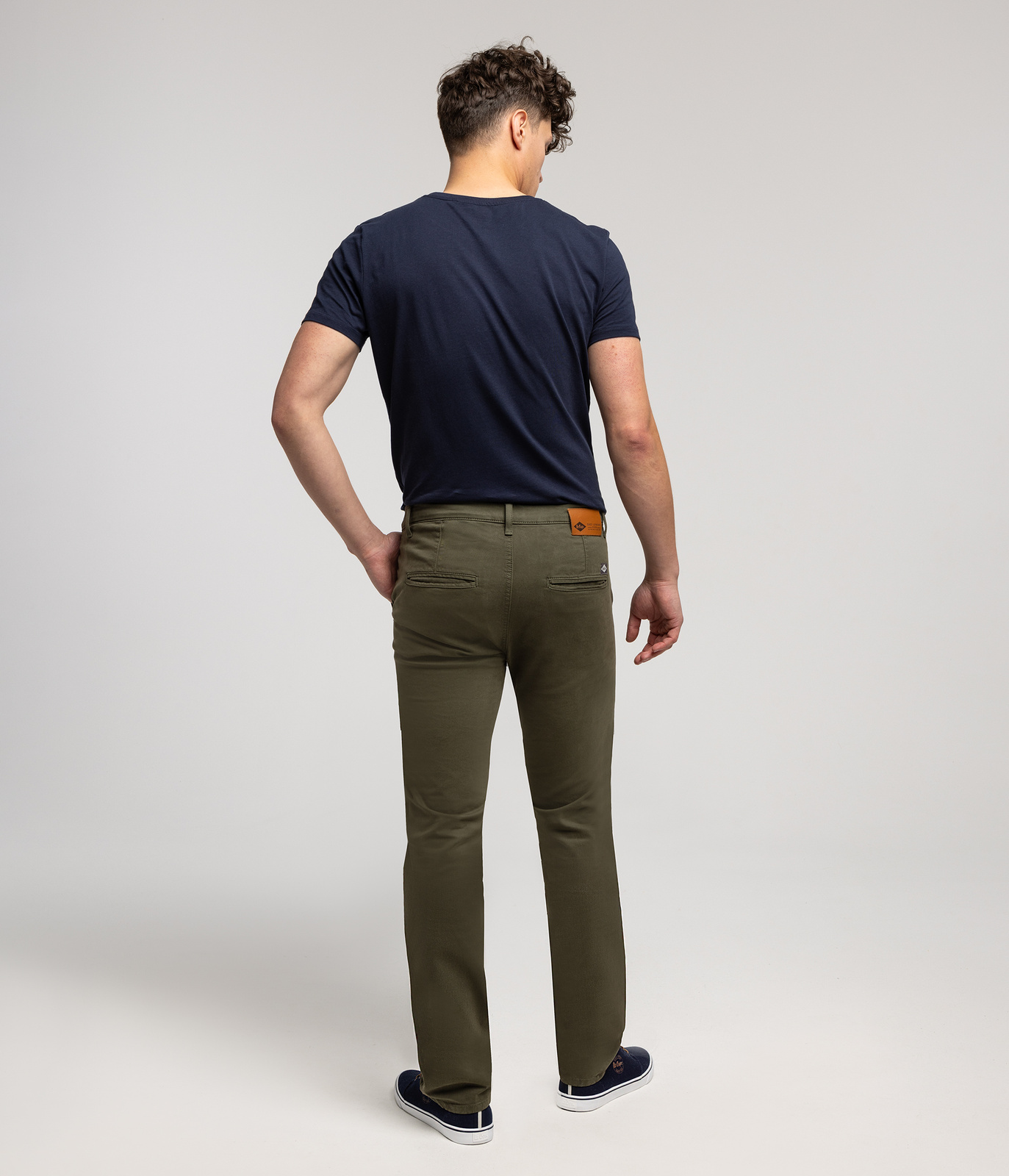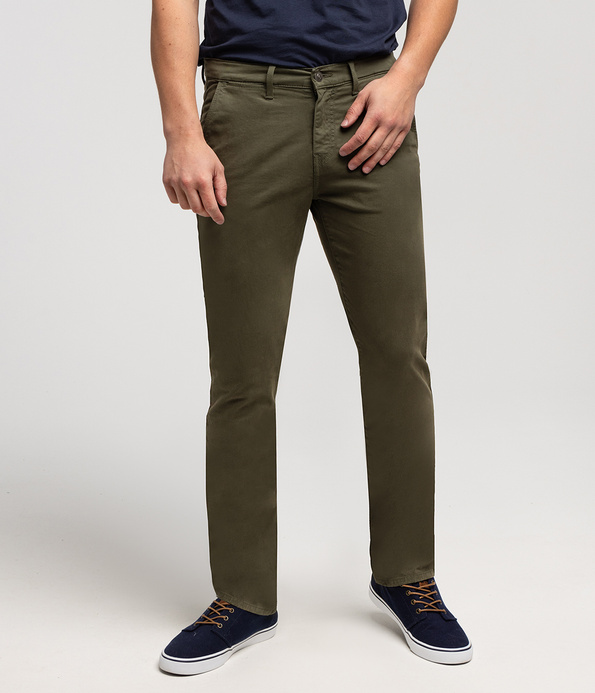 • Fason: Chino - średni stan i prosta nogawka, wygodny i uniwersalny krój.