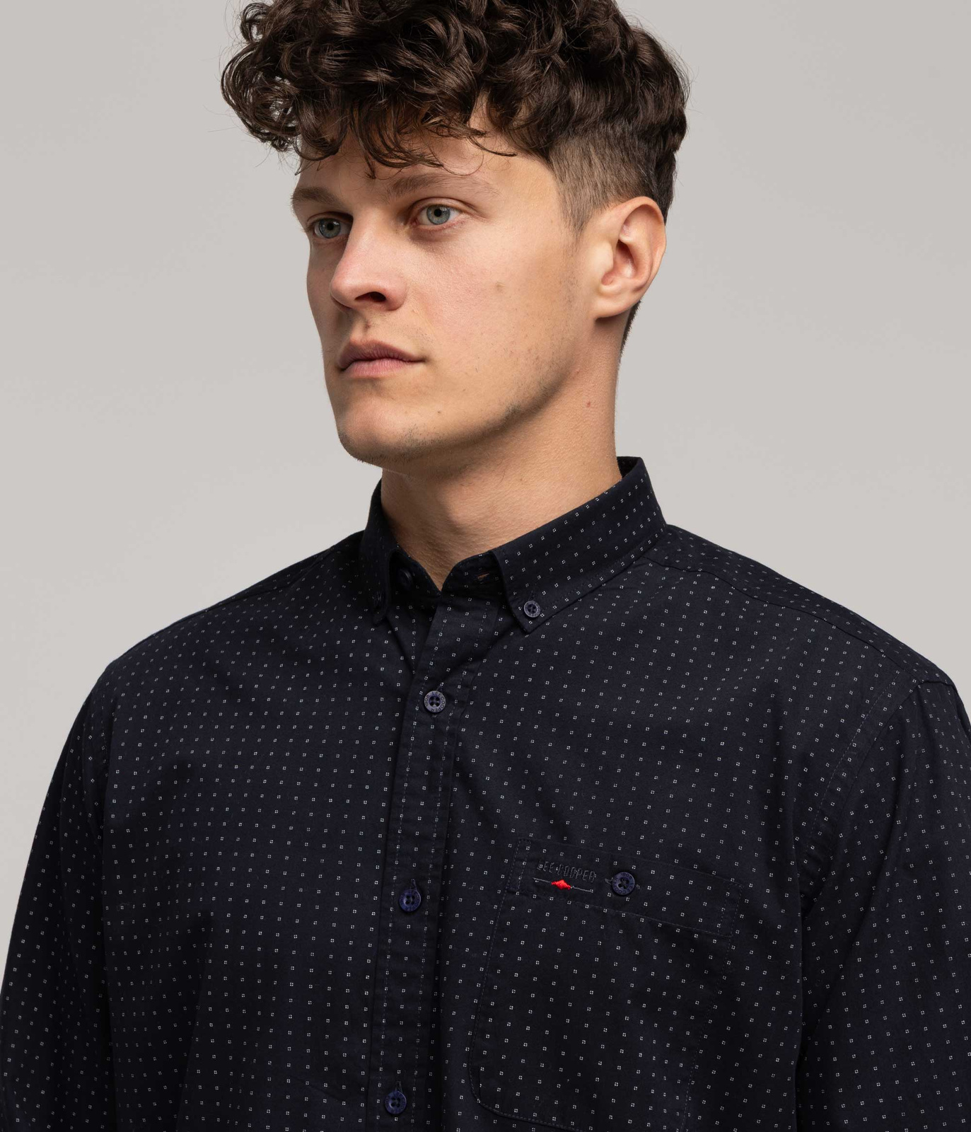 Ta męska koszula z długim rękawem o swobodnym fasonie (comfort fit) to doskonały wybór dla tych, którzy cenią sobie komfort i klasyczny, a zarazem nowoczesny wygląd. Wykonana w 100% z bawełny, zapewnia przewiewność i komfort przez cały dzień. Model wyposażony jest w kołnierzyk button-down, kieszeń na guzik oraz subtelny, brandowany haft z przodu, co podkreśla jej elegancki, ale swobodny charakter.