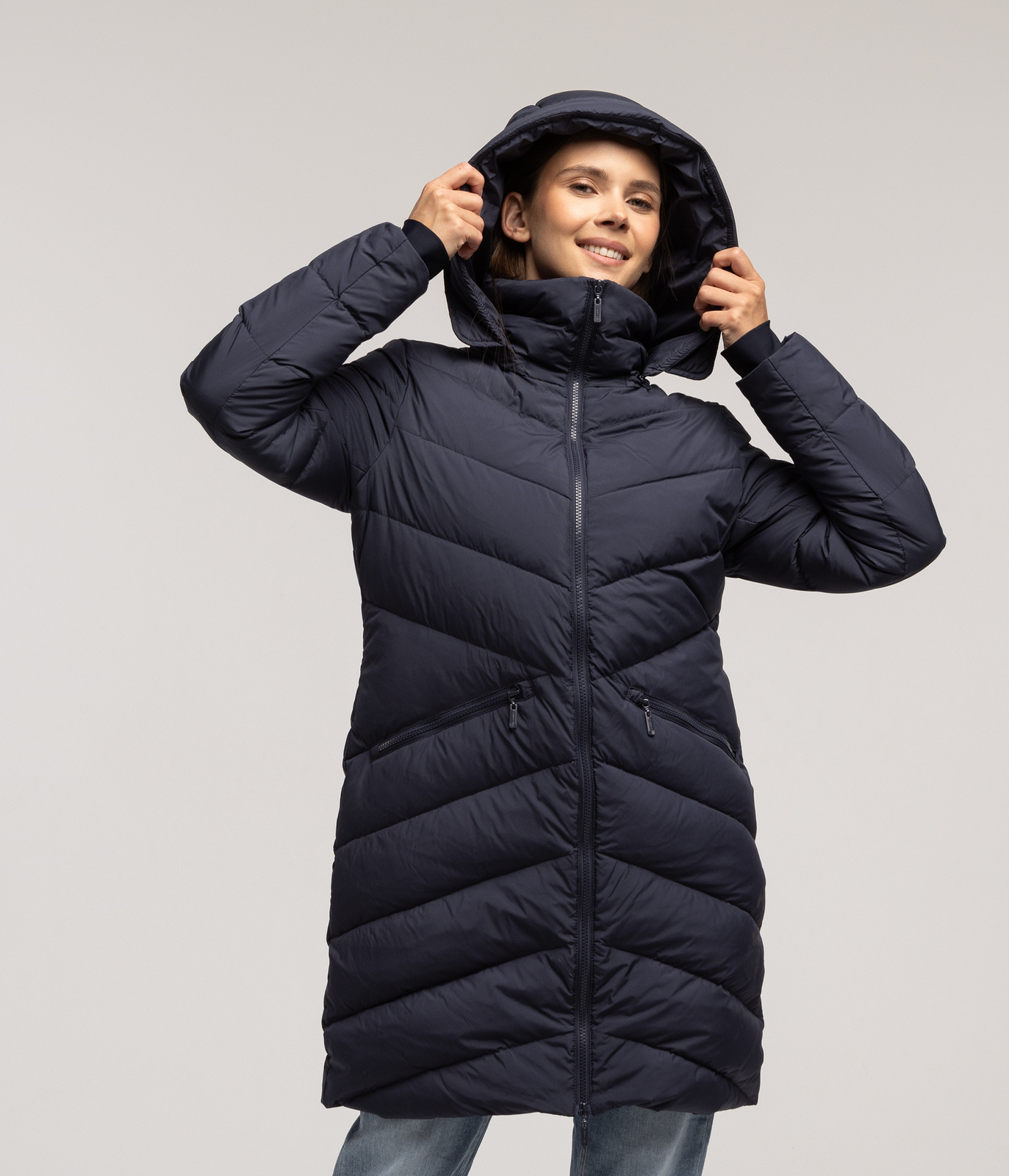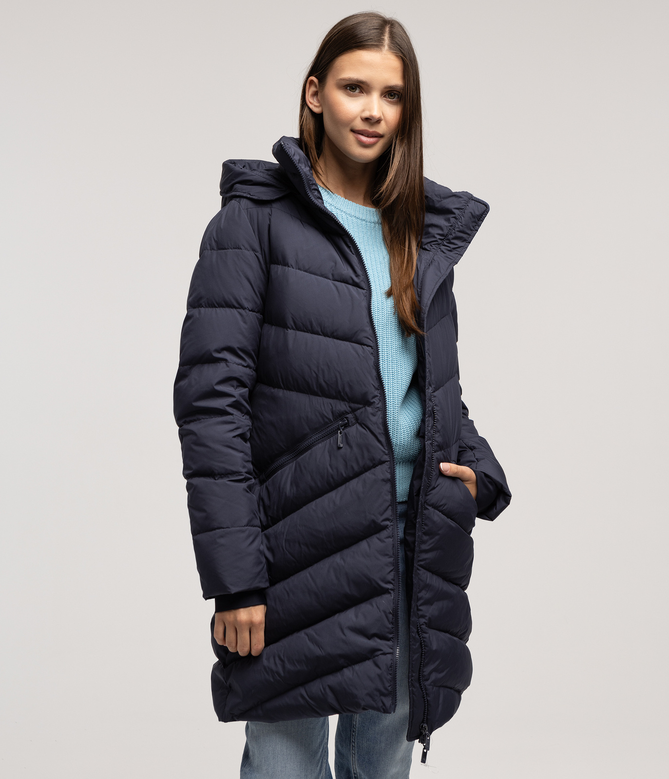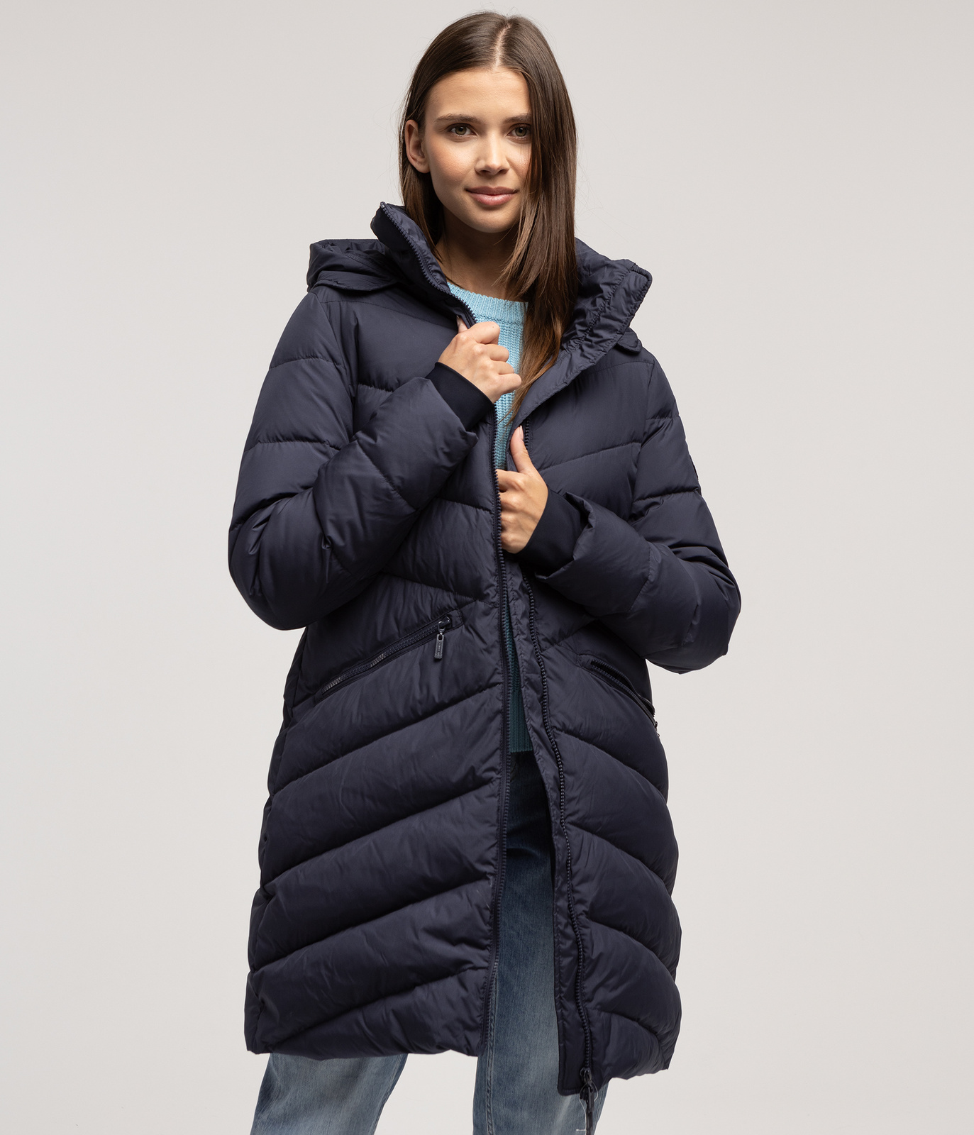 • Fason: Średniej długości puchowy płaszcz - idealny kompromis między ciepłem a lekkością.