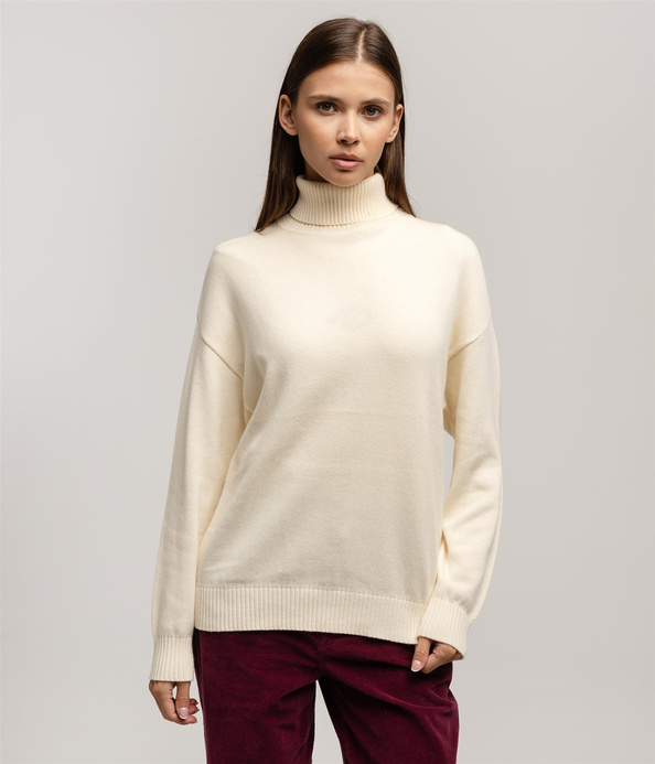 Damski sweter w pięknym, jasnym odcieniu ecru to połączenie naturalnej bawełny (95%) i luksusowego kaszmiru (5%), które gwarantują miękkość, delikatny puszek i komfort przez cały dzień. Swobodny fason z golfem dodaje mu uniwersalności i stylu, a naturalne materiały zapewniają oddychalność oraz przyjemność noszenia nawet na wrażliwej skórze.
