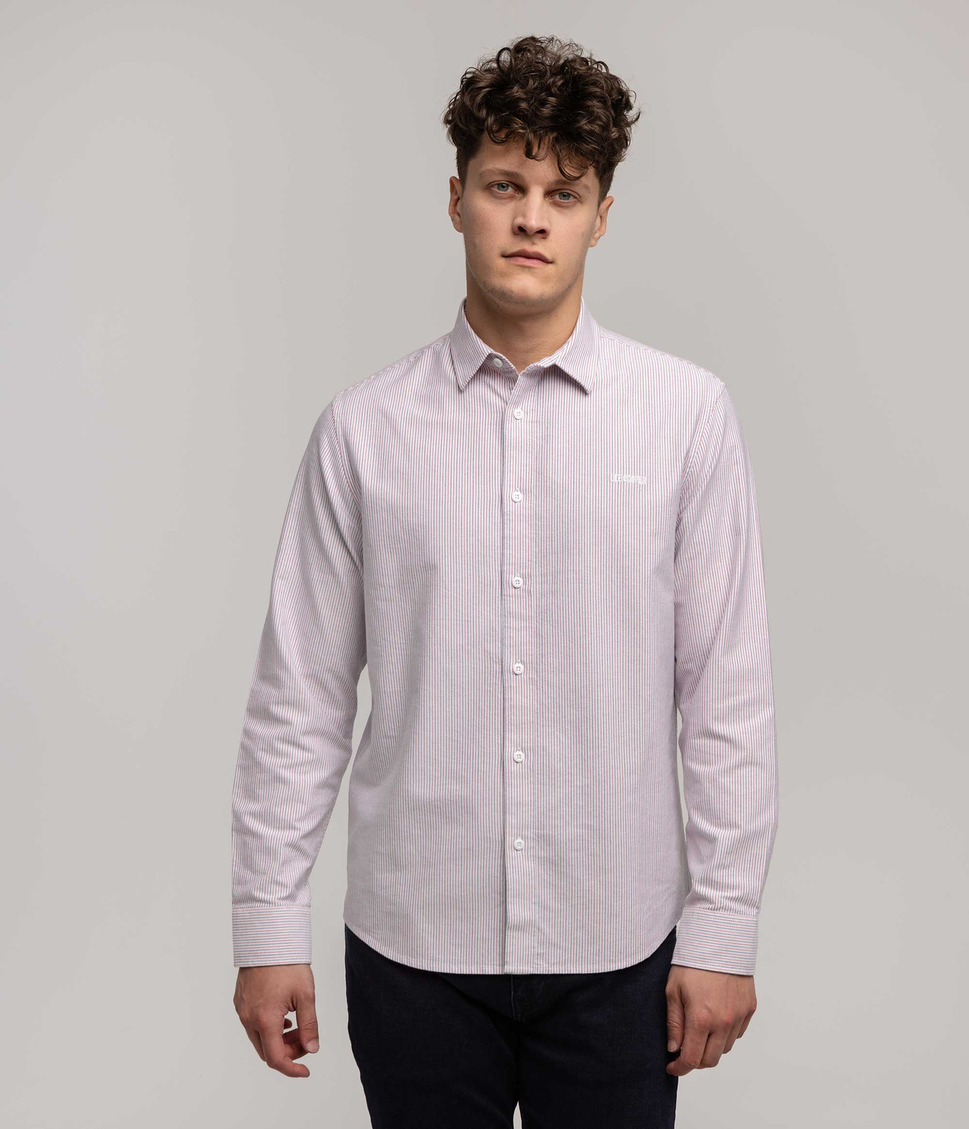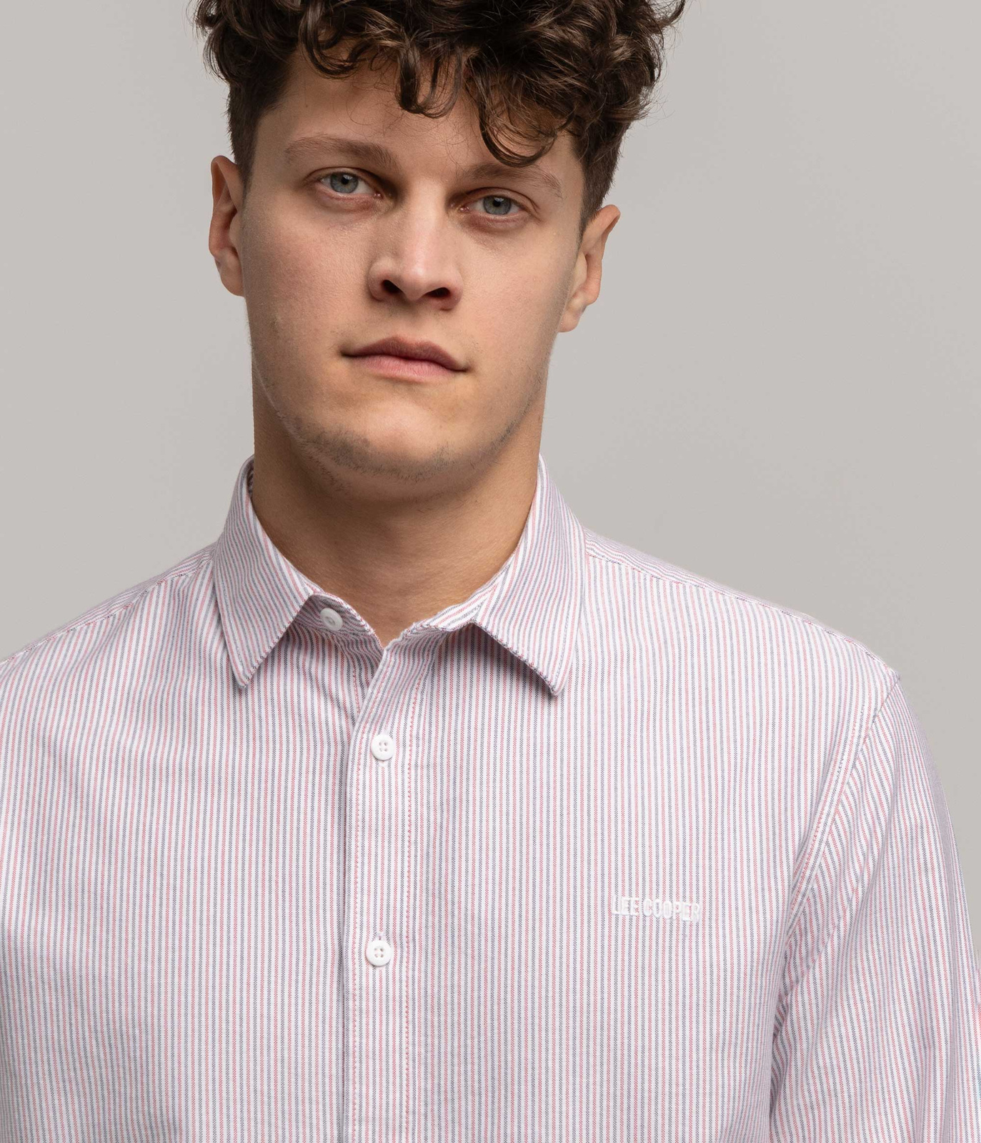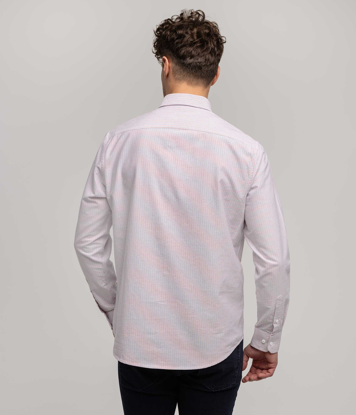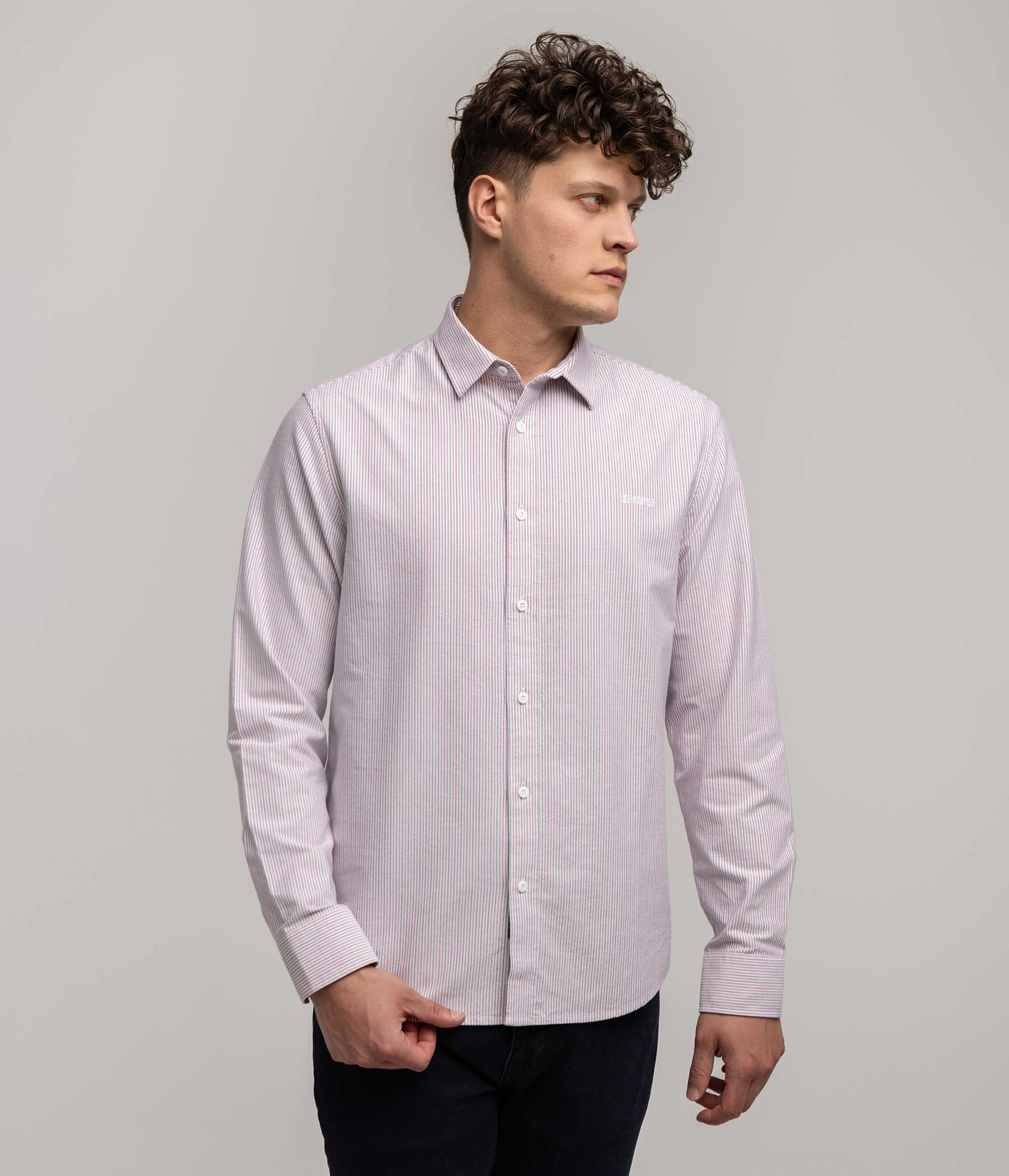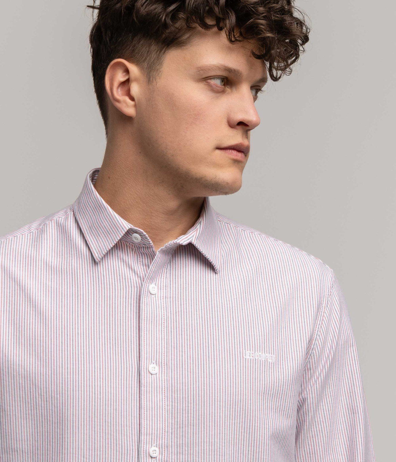 Koszula Oxford w czerwone paski to stylowa propozycja dla mężczyzn, którzy cenią połączenie klasyki i charakterystycznych detali. Wykonana w 100% z wysokogatunkowej bawełny, zapewnia komfort noszenia przez cały dzień. Charakterystycznym detalem jest wyszywane logo na lewej piersi, które podkreśla oryginalność i markowy styl koszuli.
