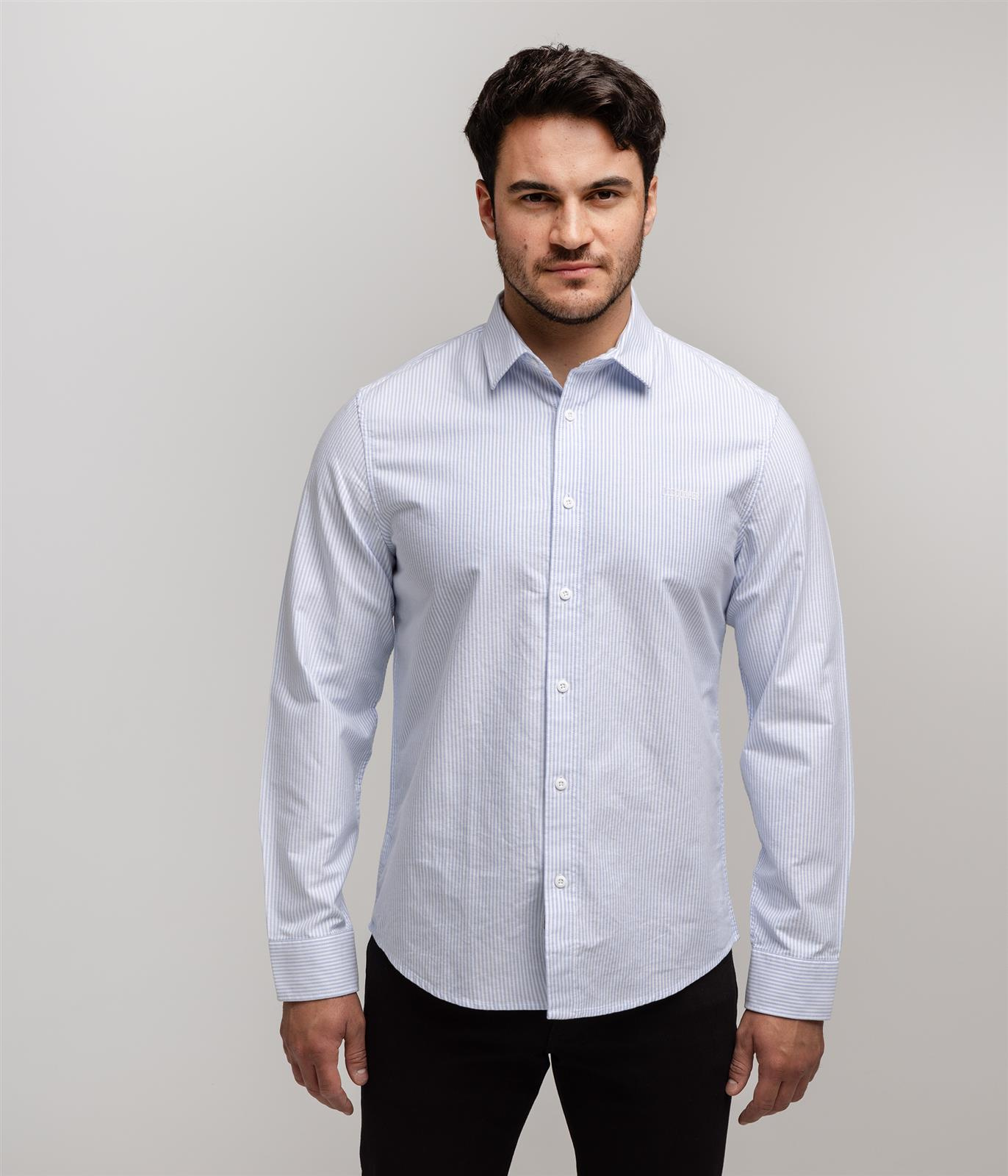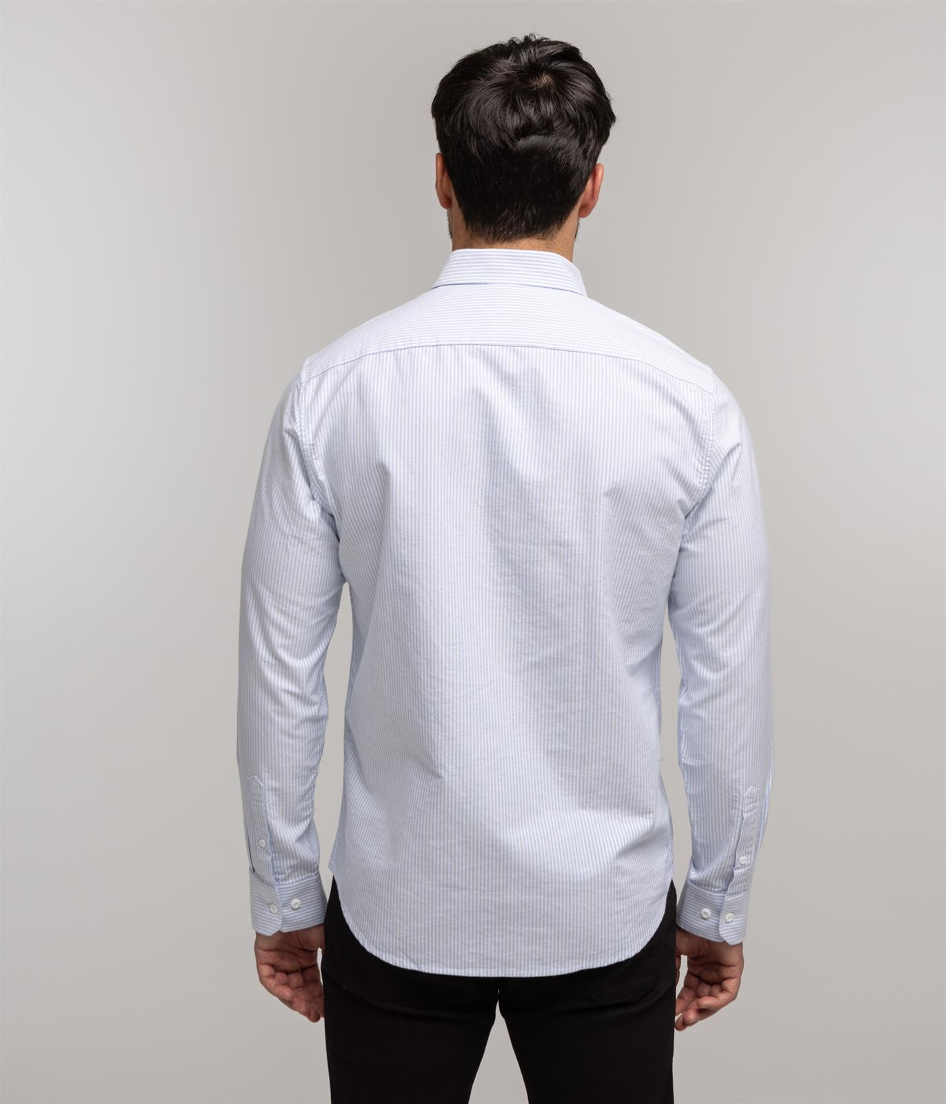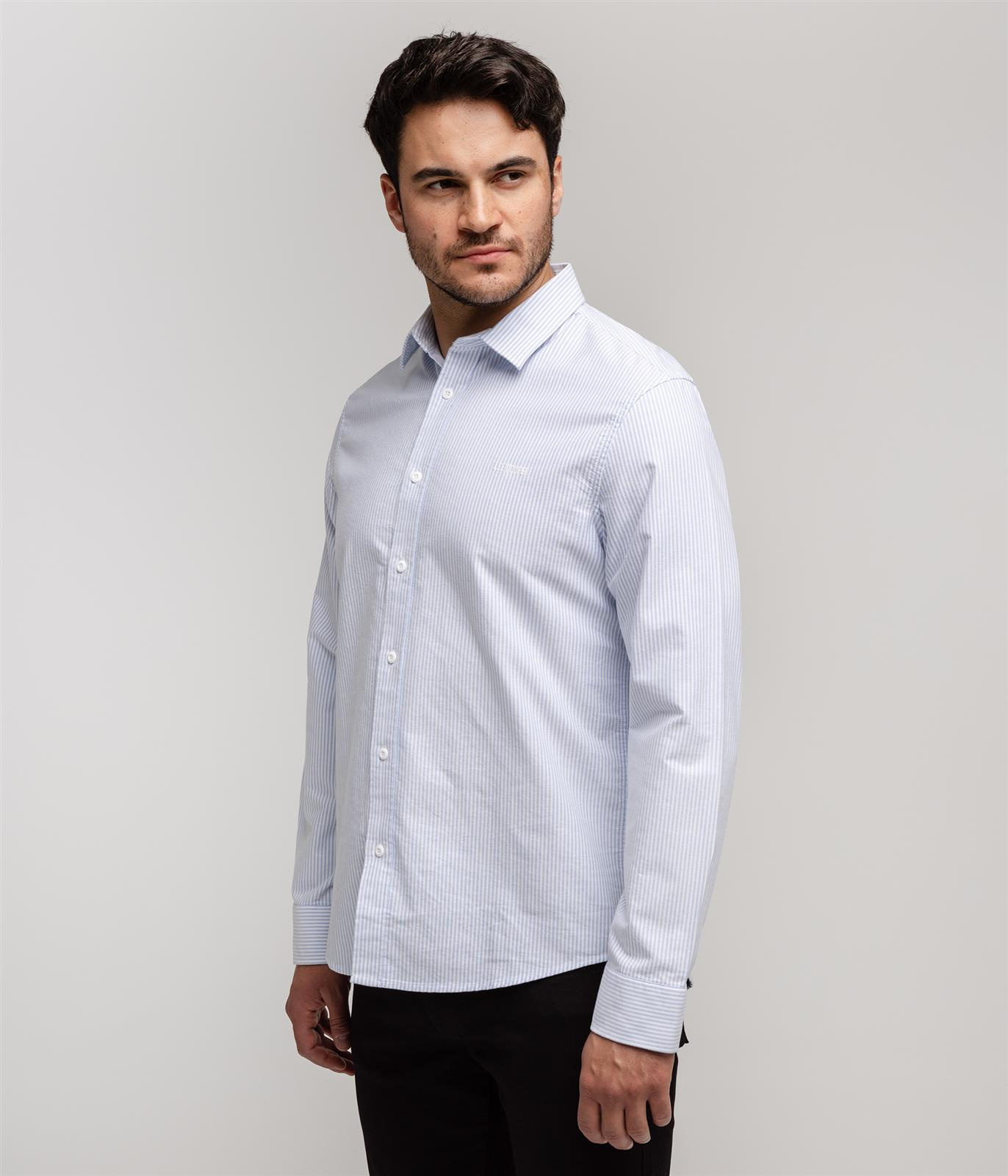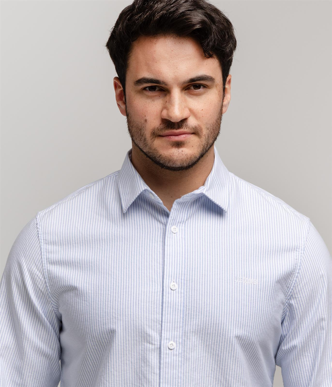 Model Oxford to ponadczasowa koszula łącząca elegancję z codziennym komfortem. Wykonana w 100% z wysokiej jakości bawełny, zapewnia przewiewność i wygodę przez cały dzień. Delikatny, niebieski prążkowany wzór nadaje koszuli oryginalności. Charakterystycznym detalem jest wyszywane logo na lewej piersi, które podkreśla oryginalność i markowy styl koszuli.