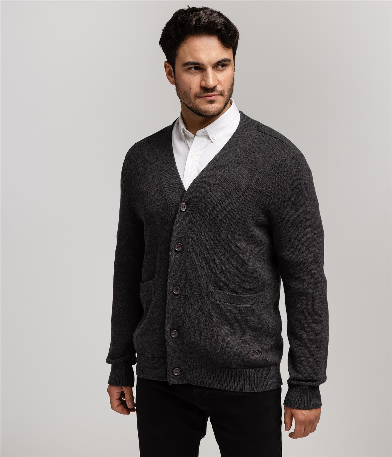 Kardigan JUAN 1813 w odcieniu Dark Grey Melange to idealny wybór dla mężczyzn, którzy cenią klasykę połączoną z luksusem. Model zapinany na guziki, z praktycznymi dwoma kieszeniami i ponadczasowym dekoltem w serek, wykonany został z wysokiej jakości materiału z dodatkiem kaszmiru, który zapewnia wyjątkową miękkość i komfort noszenia.